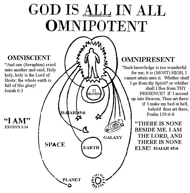 My mind is channeled upon the ever presence of God. In manifesting Himself, He has keyed my attention to the fact that He IS. Concerning the Father, "He is before all things and by Him all things consist"... Colossians 1:17. "For in Him we live, and move, and have our being... for we also are His offspring," ACTS 17:28. God is teaching me the magnitude of our Oneness with Him, and the awesomeness of what He IS staggers the imagination. Magnifying the depth of Colossians 1:17, EVERY VISIBLE OBJECT INCLUDING THE GALAXIES AND THE VASTNESS OF SPACE ARE HIS SUBSTANCE. This was explained to me using the sun as an example. Rays of sunbeam extend out of and far beyond the sun. It is as if the chair I am sitting on is the very tip of one beam changed by His thought to be what it is. Thus all objects we see and feel, and the whole universe are all His substance outside of Him yet upheld by Him and are extensions of His power radiating from Him. Maybe we will never be able to totally see God as He is because of the sheer magnitude of His majesty. But He is letting me know Him and get acquainted by and through my limited ability to comprehend. From Secrets XXIV:3-5 are these Words, "Hear, Enoch, and take in these my Words, for not to my angels have I told my secret, and I have not told them their rise, nor my endless realm, nor have they understood my creating, which I tell thee today. For before all things were visible, I alone used to go about in the invisible things, like the sun from east to west, and from west to east. But even the sun has peace in itself, while I found no peace, because I was creating all things, and I conceived the idea of placing foundations, and of creating visible creations." And even though He has revealed to me more of who He is, the words of the angel to Hermas are set aglow in my mind: "First of all believe that there is One God who created and framed all things from nothing into a being. He comprehends all things and is only immense, NOT TO BE COMPREHENDED BY ANY. Who can neither be defined by any words, nor conceived by the mind," II Hermas I:1-3. You will see where I am when we add the words of God to John from Acts of John in the New Testament Apocrypha by Hennecke, section 101, "But what I am is known to me alone, and no one else. Let me have what is mine; what is yours you must see through me; but me you must see truly not that which I am, (as) I said, but that which you as (my) kinsman, are able to know ... You must I know me as, then, as the torment of the Logos, the piercing of the Logos, the blood of the Logos, the wounding of the Logos, the fastening of the Logos, the death of the Logos. God is the foundation and support of everything that He is. So to Isaiah He declared, "The heaven is my throne, and the earth is my footstool: where is the house that ye build unto me and where is the place of my rest?" Isaiah 66:1. Going further David declared, "Thou hast beset me before and behind, and laid thine hand upon me. Such knowledge is too wonderful for me; it is high, I cannot attain unto it. Whither shall I go from thy spirit? or whither shall I flee from thy presence? If I ascend up into heaven, thou art there: if I make my bed in hell, behold, thou art there," Psalm 139:5-8. Awed by the Omnipresence of God Solomon said, "But will God indeed dwell on earth? Behold the heaven and the heaven of heavens cannot contain thee," I Kings 8:27. Because all creation and all objects are indeed various forms of the power issuing and extending from His Person like rays from the sun, we come to the brilliant meaning of ACTS 17:28: "In Him we live, and move, and have our being". "He is before all things and by Him all things consist," Colossians 1:17. All of us are one in Him and He in us, for He is the substance of our spirit and also the consistency of what we call the (flesh) clay! He is the length and breadth, and depth and height, for He IS ALL and in us all! In manifesting Himself to me, He has shown me that portrait of Himself. "And no man knoweth the Father, save the son and He to whomsoever the son shall reveal him," Matthew 11:27. I love my Father and I do humble myself and rejoice at His awesome and glorious majesty. Who could have possibly known Him and discovered Him, since He is so big that such a description no one could think to imagine or fathom? Truly eyes have not seen, nor ears heard, nor has it entered the heart of men nor yet the devil. God is too much to comprehend or to see totally and fully. I cannot fathom the vastness of space. I wear eyeglasses now; so how can I see all of Him at once? But I do appreciate seeing that part of Him I can see even in my mind! When He said, "I said ye are Gods and all of you are children of the Most High," how many believed Him? There is no lie in Him, nor deceitful guile, nor were those words allegorical or parabolic. He divided Himself into many pieces which we call people and indeed He is us! He is as true as His Word and WE ARE GODS, (or His multi-portioned second Body). What is done to anyone is done to Him. We cannot feel or sense anything except He allows us a portion of what He feels. Can you imagine all the pain He is suffering in all those in pain at this very moment? So when we "look at whom we pierced," we must look at Him and then at ourselves. "In all our afflictions, He is afflicted," Isaiah 63:9. These things are worth pondering for the LIGHT IS SO BRIGHT that men are sometimes blinded by it!