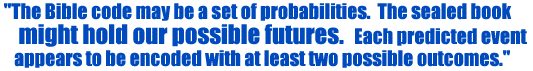 The questions are endless, but I too found myself wanting it to be discounted, to be proved incorrect. But if the scientific community doesn't dispute the findings, what are you to believe? When fanatical religious cults or self-professed profits claim to know the date of Armageddon or of the second coming, it is easy to dismiss with no scientific evidence. With the Bible code however, so far an irrefutable mathematical model has been developed and the code continues to be revealed.