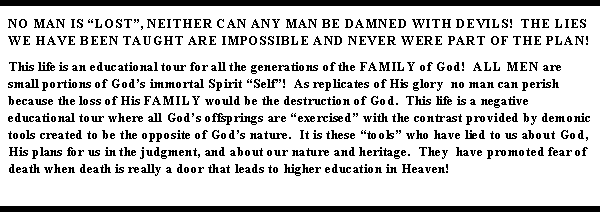 This life is an educational tour for all the generations of the FAMILY of God! ALL MEN are small portions of God's immortal Spirit "Self"! As replicates of His glory no man can perish because the loss of His FAMILY would be the destruction of God. This life is a negative educational tour where all God's offsprings are "exercised" with the contrast provided by demonic tools created to be the opposite of God's nature. It is these "tools" who have lied to us about God, His plans for us in the judgment, and about our nature and heritage. They have promoted fear of death when death is really a door that leads to higher education in Heaven!