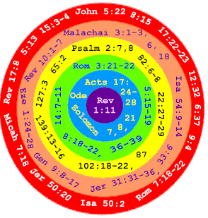 2. RAINBOW AND COVENANT: Since the angels (arch) are signified in parabolic color codes, we find the rainbow shaped in an ARCH to signify the PERPETUAL COVENANT God made with mankind, Genesis 9:8-17. Ezekiel saw the rainbow around the throne and the four archangels carrying the throne, or carrying God's Word, Ezekiel 1:4-28. Since the parabolic (Psalm 78:1-5) pattern of Heaven was given to Moses as the tabernacle he constructed (Exodus 25:8-9; Isaiah 40:22, 66:1) we find that the ark which housed the Ten Commandments was allegorical. Its four sides represented the four archangels who carry the Word (Throne) of God also, Psalm 18:8,10; Ezekiel 1:20-24. Thus the "ark of the covenant" which the priests carried signified the four archangels. As an object to teach us the spiritual "reality," the one they carried is no more, Jeremiah 3:14-17. God has opened up His body to you, Ode 12:3, Revelation 11:19, 21:22. John saw the spiritual real thing, and Moses' schoolmaster device was done away, Galatians 3:23-25. (Christ's body of flesh was his ark, and the Word was in his heart, Hebrews 10:5,7.) The "crown" of the ark represented the "throne power" God gave the four archangels, Zechariah 6:9-14. Moses in the ark on the river also signified the saving power of the archangels since God used him to represent His Word (throne), Exodus 2:2-10; Deuteronomy 5:22-28; Isaiah 63:9; Luke 16:22. We might also add the analogy of Noah's ark and learn its spiritual lesson. Noah and his sons represented the four archangels, and the ark itself signified their saving power. The clean animals represented men with understanding, Romans 12:1, and the "unclean" animals were men with no knowledge, Psalm 49:20; Acts 10:9-20. Therefore, Noah's offspring formed the four major races of mankind under the colors (authority and covenant) of the archangels: (1) Negroids- Blacks (2) Caucasoids- Whites (3) Mongoloids- Pale or Yellow (4) Indians: "redskins"- Red, Revelation 6:1-8. To HARK means to HEAR the ARCH -angels: